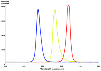 Another breakthrough has been the invention of white LEDs - see the picture below, where we can see the peak in the blue region, a dip in the green region and a lower peak in the red region. .